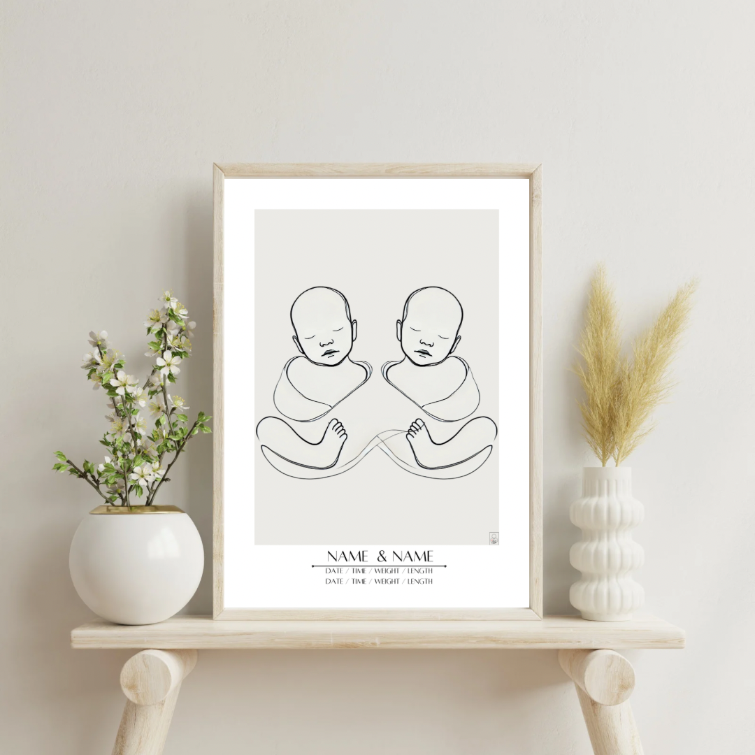 Our beautifully designed Twins Poster. Thoughtfully created to honor both little ones side by side, this timeless piece features a clean, minimalist design that highlights their unique birth details while capturing the unbreakable bond they share from the very beginning.